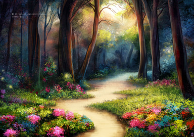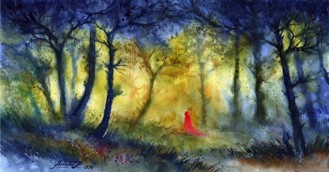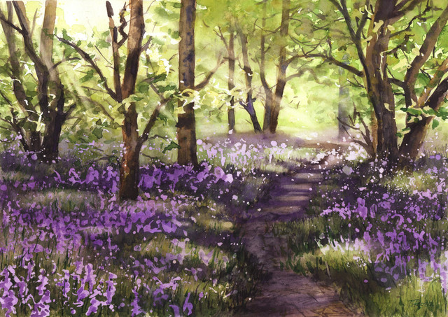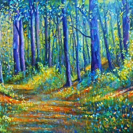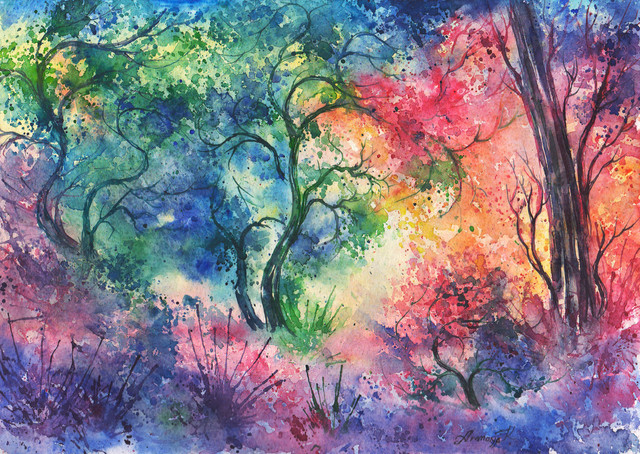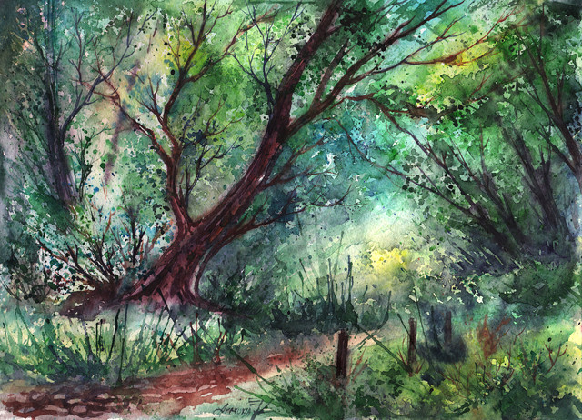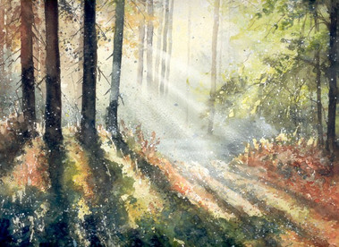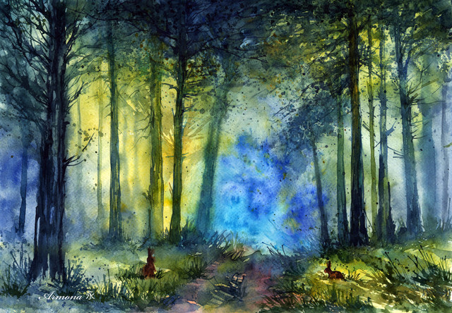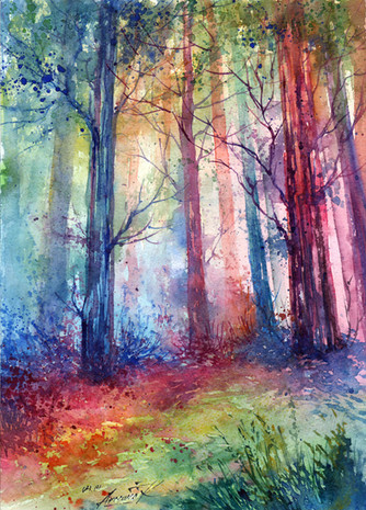 Warm rays of the sun streaming through the fresh green of the beautiful forest.watercolor( and some acrylic ), A4
