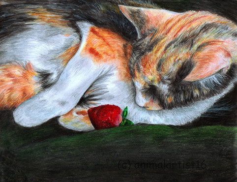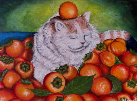 From a distance, it makes it look real. I'm impressed on how many details you put in here, especially the cat fur and the coloration of the apples.Β