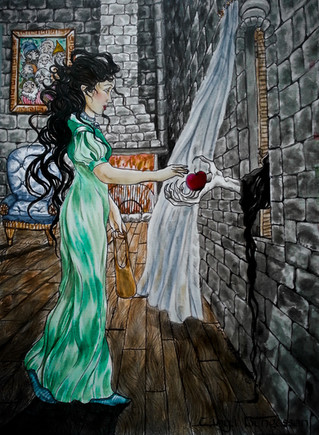 Very lovely! I like that you've chosen to keep the queen disguised as crone out of the picture, showing just her old hand with the apple, that keeps the focus on Snow's choice, and you can see her hesitation in the movement of her hand.