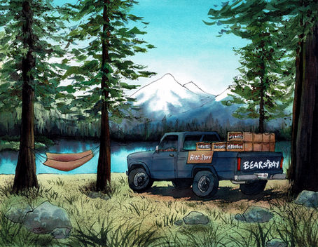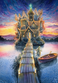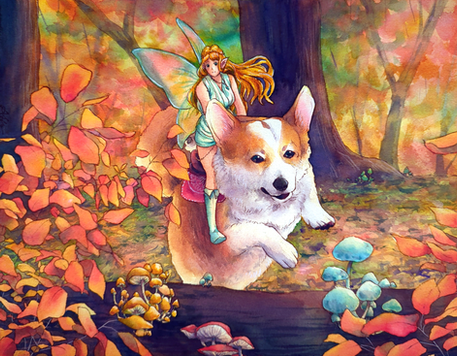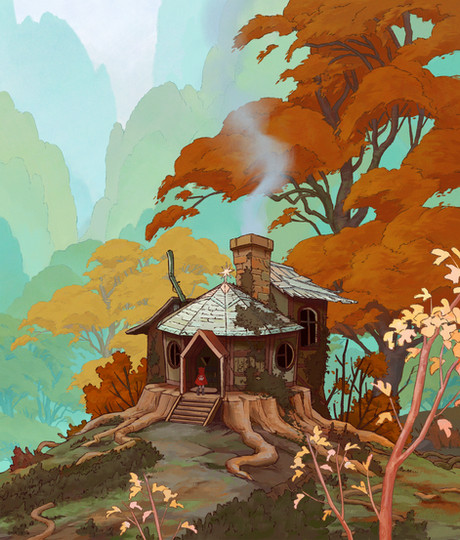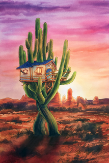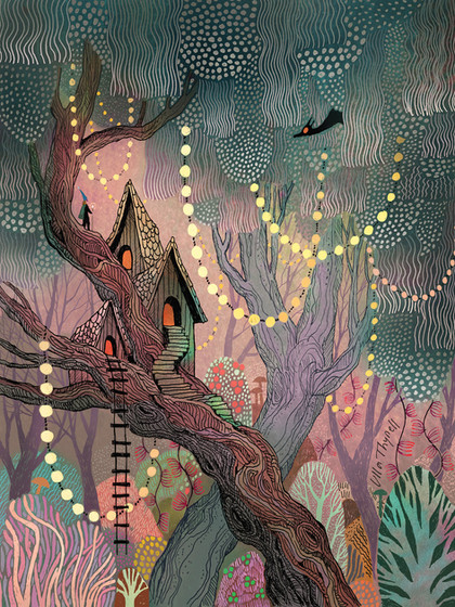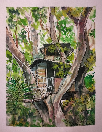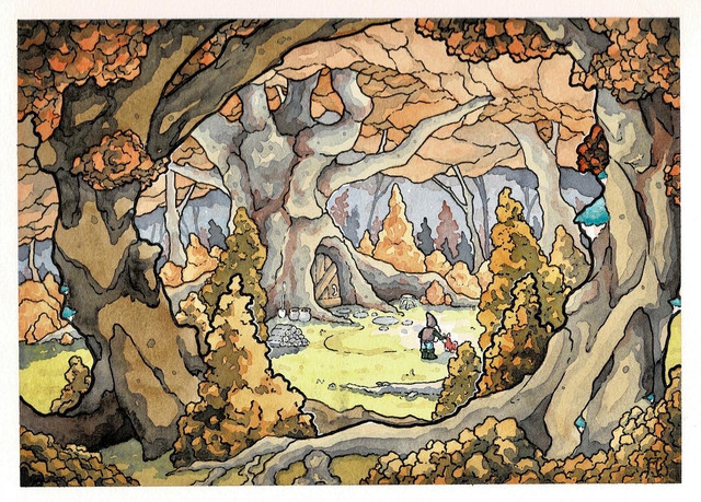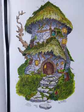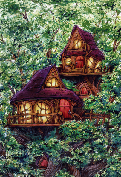 Large watercolor painting commission for ravensfireknifeworks of a fantasy treehouse scene, complete with a mysterious villager! It would be so cool to live in a house like this...This painting took forever but really enjoyed the whole process of design, color scheme, line work, coloring and finally shipping! Hope you guys enjoy it as much as I did creating it.