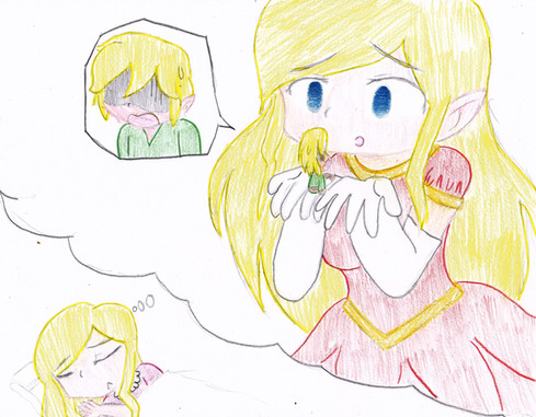 Link and Bluebird were winding down for the night. Link was getting his bedroll set up when Bluebird dragged a blanket over and plopped down behind him. Patiently waiting for him to finish. Link paused for a moment. Then turned around. "What?" Bluebird asked, looking over her shoulder to see if he'd seen something behind her. The second she looked away, Link playfully scooped her off the ground. She gave a little surprised squeak as he did so. Then he took her blanket and wrapped her up in it like a tiny burrito. She sat there for a few moments. Processing. Then she broke into a grin and started laughing. "Liiiiiiink!" She outright cackled when he put a hand over her, earning plenty more giggles and a brief game of gentle whack-a-mole (which consisted of him simply poking her head wherever she tried to peek out of the blanket). Eventually, both grew drowsy. Link gently set her down, and snuggled into his own blankets.Bluebird decided that he made a better blanket. She climbed over his arm, once he was truly asleep, and wrapped herself up in some of his hair. She snuggled into the soft warmth, giving a contented little sigh as Link's arm snaked up to lightly press her against his cheek.