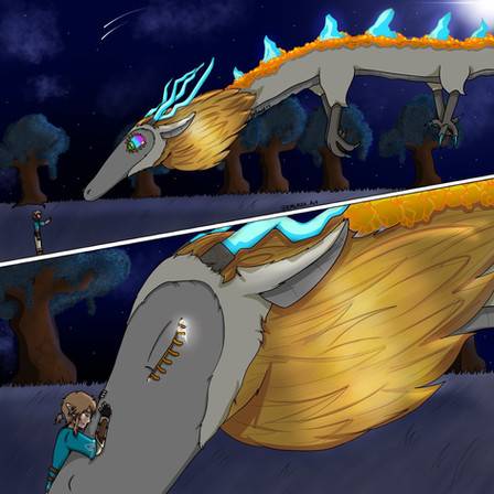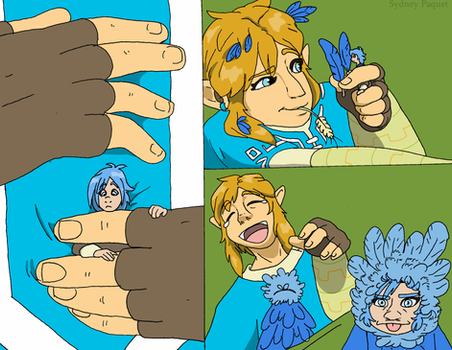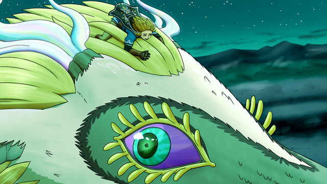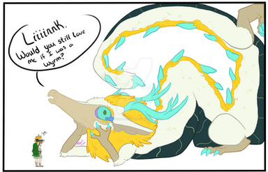 Bluebird had to suppress a squeal of joy. Her eyes sparkled as she watched Naydra drift closer. The dragon seemed to look right at them. Naydra drifted ever closer until, if Link had wanted to, he could have stepped forward and touched her as she drifted by. Bluebird was laughing, taking in the magnificent sight. The wind blew her and Link's hair about, snow getting caught in it. But she didn't mind. Any ire she had about being woken up so early was long gone. As she came to realize Link had to have memorized the great dragon's route, down to the time. The pair watched as Naydra continued on her route, slowly vanishing into the snow and clouds once more. Bluebird slid down onto Link's shoulder, grabbing onto his long sideburn and all but hopping in place: "Is she the only one? Are there others like her? Can we see them?" Link was laughing now himself as he tried to slow her down a little. 'Yes, yes! There's three others. Two I know. One is... New. There's Farosh, she's the golden guardian spirit for the Spring of Courage. Red Dinraal, Spring of Power. But then there's what people have been calling the Light Dragon. She appeared recently... She's beautiful. White with a golden mane, and blue antlers. Like a stag.' Bluebird grinned ever wider. Giddy with joy. Link gently grabbed her in one hand, bringing her to his front. 'I'll take you to see them all, don't you worry!' he signed with a big grin.