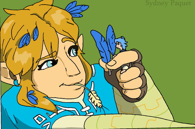 Bluebird was ecstatic to see all the soft pink lights. She loved seeing the fairies. Their presence was comforting. They were hanging near the water's surface, however, meaning she couldn't reach them without possibly falling in. So she had resigned herself to watching them from where she was. Until, that is, Link crept up behind her. He smiled knowingly. He took off the bracer and glove of his right hand. And rolled the sleeve up for good measure. Bluebird ran over to him, eagerly pulling at his fingers before climbing into his hand. Link laughed softly, then crawled forward on his belly. Slowly, and keeping a good grip on Bluebird, he lowered her to the water. The fairies danced around her, much to her delight. They flitted over and under. A few even came up to see her. Some were big, some were small.She looked back at Link with a huge smile on her face. He simply smiled back. Suddenly there were fairies everywhere. All around. In a sudden burst of activity. Link suddenly got a disgruntled look on his face, and pulled back. Bluebird was about to ask him what was wrong when the biggest fairy she'd ever seen just popped out of the water. She was huge. Like, Link was HER size compared to this fairy! Bluebird got nervous and ducked down in his hand.