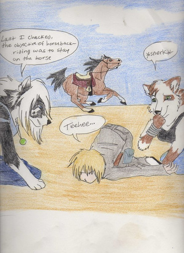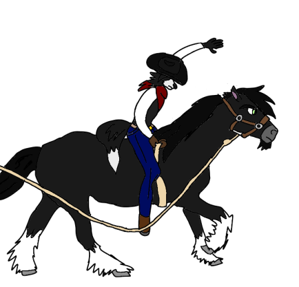 Heinkel guides a horse named Courage to help Brandon with his bronc riding skills. Apparently Brandon isn't actually riding bareback, he's leaning on Courage and the bareback riding saddle with the custom built in rigging.Gift goes to Dreemurr00