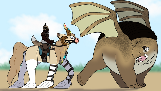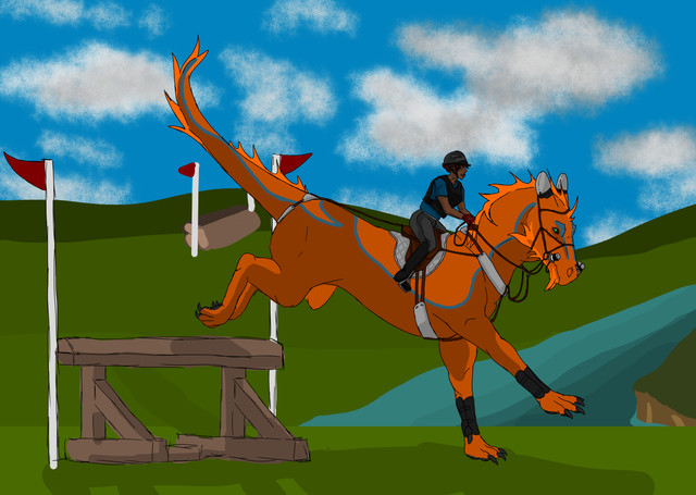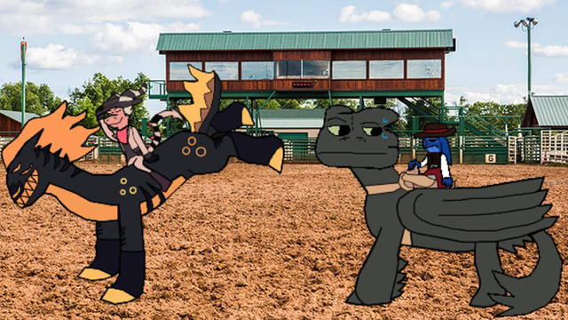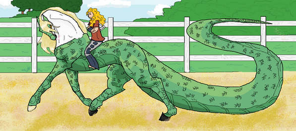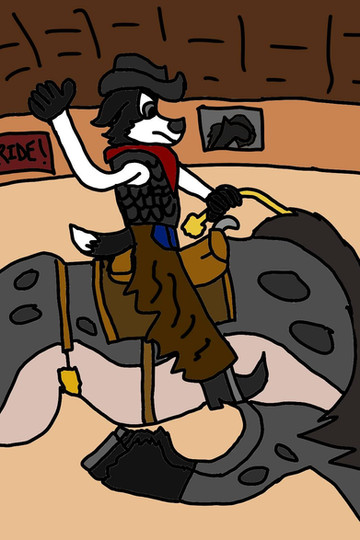 The first in one of the many ways of riding a dragon: Western style! Here's this beautiful pinto like dragon being ridden like a rodeo bull. That cowboy better hold on for dear life!Related content