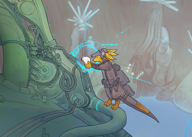 Master Engineer checking personally, that mechanical heart of his city beats properly. When you are ruler of literally a giant machine, you better understand, how it functions, or otherwise you can end in quite a steamy situation.Actually all of this bird-people know, how their city functions. It doesn't matter, if they are chemist, artist, or police officer, they all are able to maintain most important parts of this mechanism.