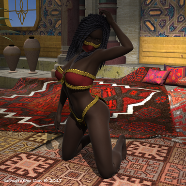 The sky background is one from Predatron's Essential Lights and Skies pack (www.daz3d.com/predatron-essent⦠which I've used in many renders and the building is DMs Zahirs Palace (www.daz3d.com/dms-zahirs-place⦠which I used for the skytop building that Zohendry was kidnapped from. I seem to associate that building with being way up on a mountaintop or on the elemental plane of air for some reason.