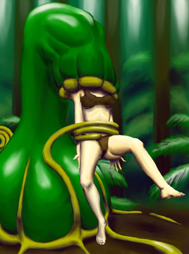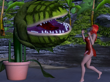 Melinda couldn't believe her luck, finding a bit of wreckage to cling to after her boat broke apart in the storm. She rode it for hours until she collided with dry land. Or as dry as a storm drenched island could be. She stumbled into the shelter of the jungle as the sun was beginning to peek out from the receding storm clouds, not yet reddening towards dusk but soon to be heading blow the horizon. In the jungle the shadows were already lengthening, save for a strange plant that was bathed in sunlight from a gap in the foliage. A sweet aroma seemed to come from the plant.As Melinda neared it she squinted into it's large central bell to see if there were any fruit inside. Her belly had been rumbling for hours. To her horror however the bell moved, orienting on her like a security camera. From within the bell a long tentacle shot out, wrapping itself around her and upending her body to draw her into the bell feet first ...