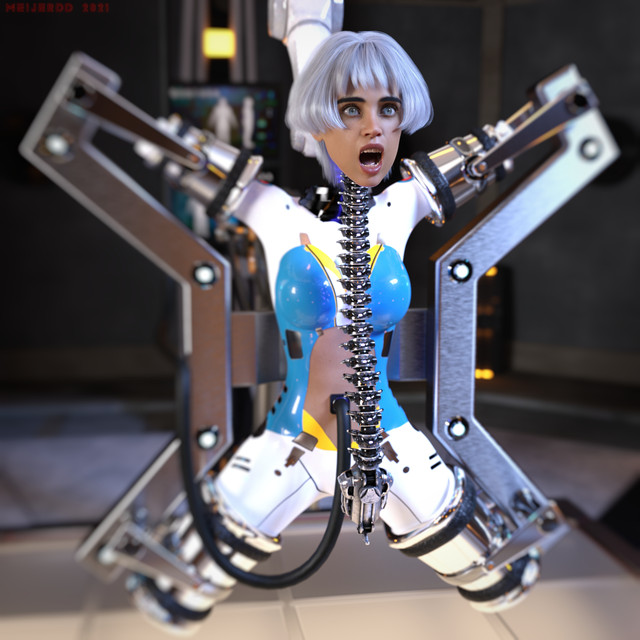 So hot to see a sexy black snoop get captured like this! I bet she was working as a private investigator hoping to escpose the lab's horrible experiments. I can only imagine what the bad guys want to do to the sexy black damsel. Having her stripped to her skimpy underwear and tied spread-eagle to this machine makes her totally vulnerable and helpless! Excellent work! Love this!