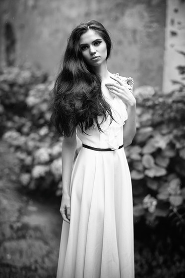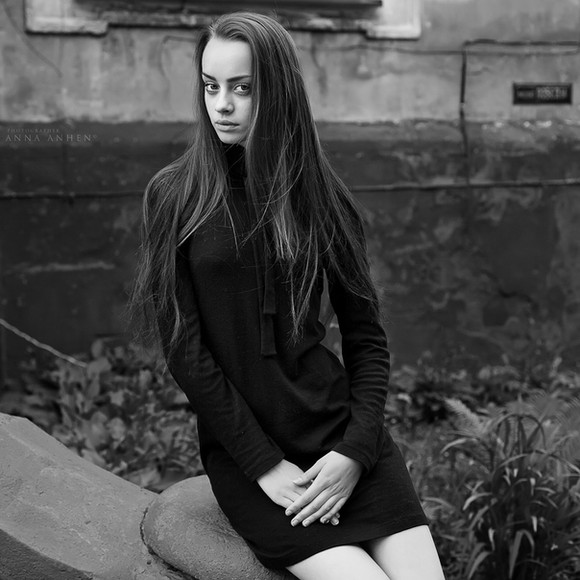 Wonderful! Honestly, black and white photos are not among my favorites, but this one is simply beautiful! Her pose is relaxed, and her eyes mysterious. I love the contrast between the subject and background, too. Might I ask what camera you used?