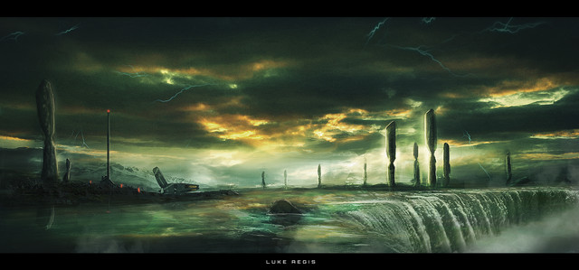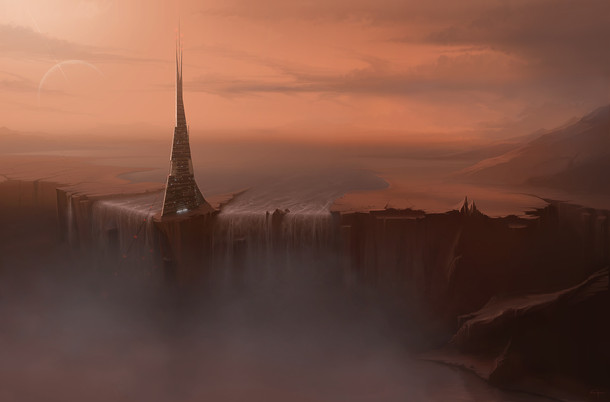 "Between two gigantic waterfalls, a lone structure pierces the sky. Bearing down upon the landscape the tower is almost overpowered - in spite of its enormity - by the vast spectacle of the landscape which supports it."