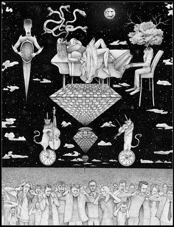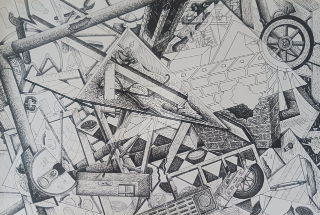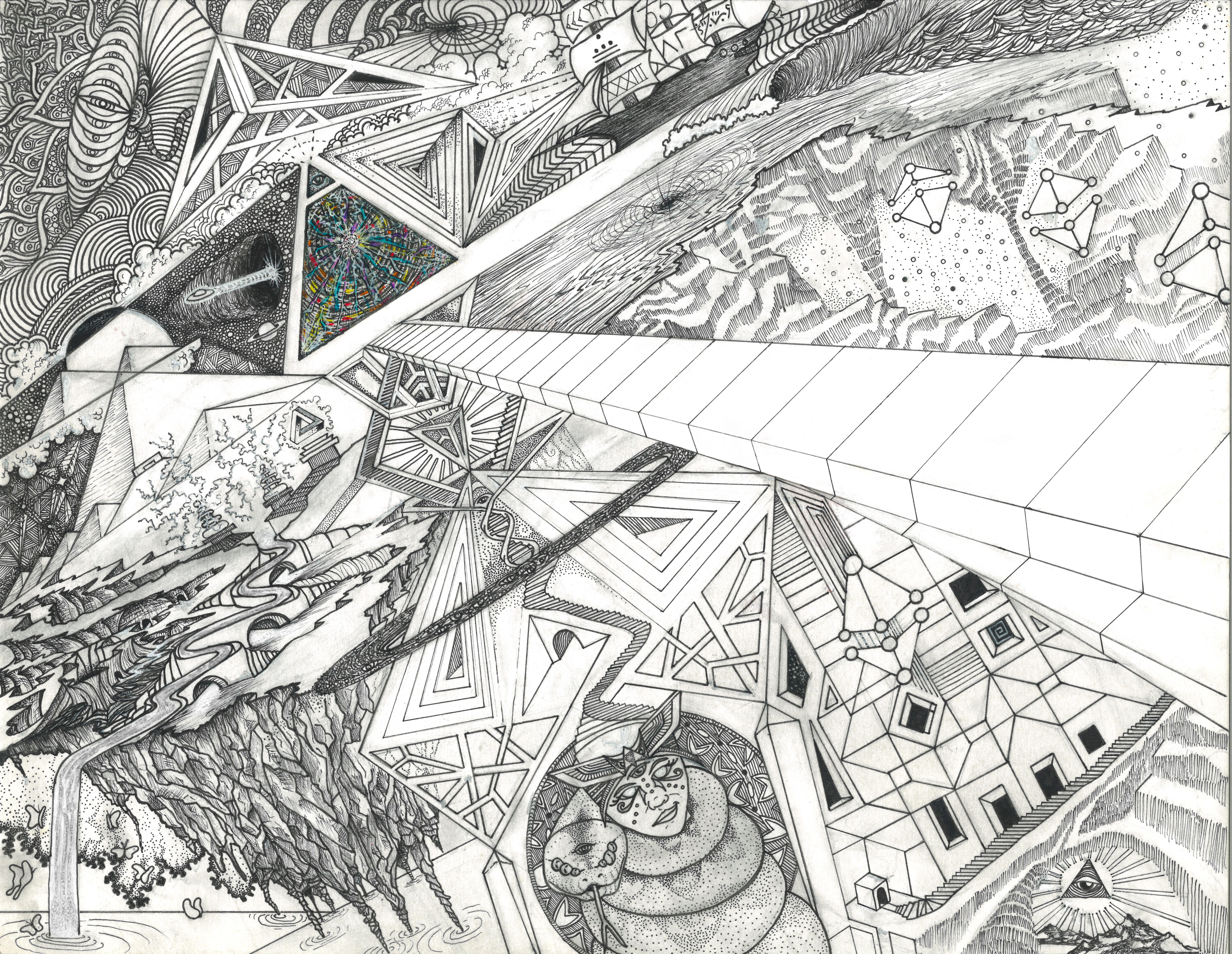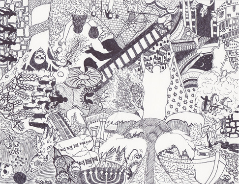 An ink drawing of multiple locations converging into each other.Made with ink.Β