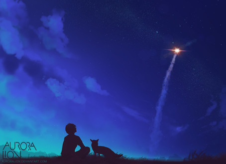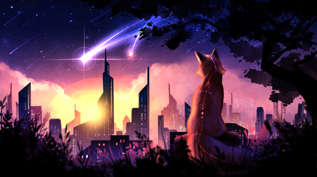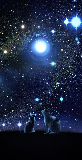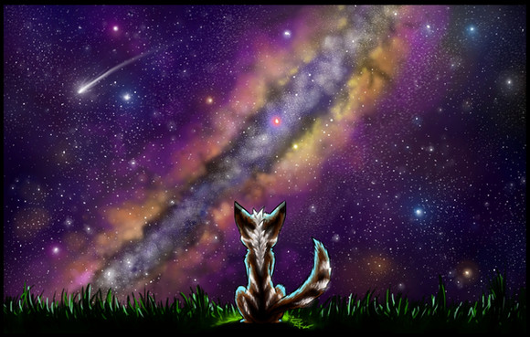 Very beautiful and a gorgeous work! The colors are so magical and the stars are deeply satisfying to look at~ :3 And well done on coloring and shading the sky,clouds, and that cat.Β Β