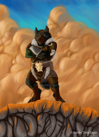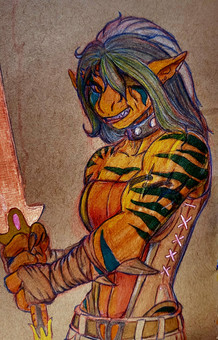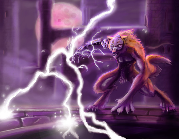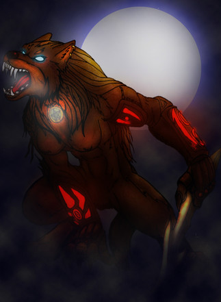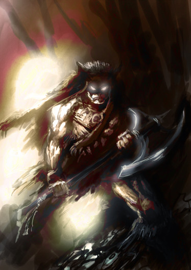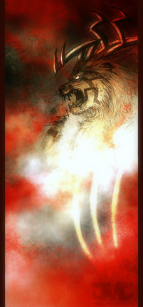 The figure slowly dragged himself up from the fiery fissure and glanced around at the fighters who now cowered before him, his eyes so intensely blue that they glowed as bright as the flames that roared all around him. He was a beast of immense size with a long main of black fur and an acient sword strapped across his back, a long snout filled with immense, pearl-white fangs and black claws like daggers.