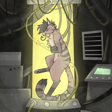 It's supposed to be a wolf-puma creature with a green mane along its back that can create portals. In that case, I have no idea why this dude in this pic here doesn't just portal his way out instead of smashing up the glass tube xP For epic effect, I guess? x3 I tried to make it look like a wolf-puma but that's hard from a front-view... I guess I coulda changed the nose, though... >_<; But thats why the paw pads are pink. Like a kitty!