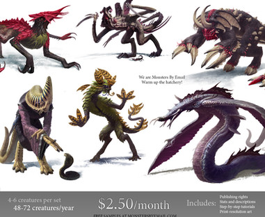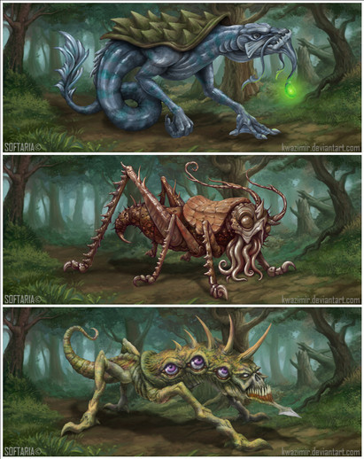 For Game Design class we had to design a board game in groups. My group decided to try doing a survival-horror board game- something you don't usually come across. I took on role of Lead Artist, and did the illustrations for the creature-type monsters (~Radioactive-Insanity came up with the designs for the lvl3 and lvl4 needles, which are awesome and thanks again for the help!!), created the logo for the game, made a book for the monsters with their corresponding information (the "Encounter Guide"), and decked out the game grid / board/ levels (4 total, I didn't design the levels though, that was a collaborative effort between two other people). Pretty much non-stop work and a week straight of allnighters by the end of it.