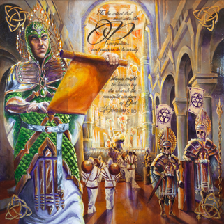 So that's Raphael's story. I tried to bring that whole deal into the symbolism in this picture. There's Raphael, disguised as a traveler, sent from heaven. At the top are Sarah and Tobias, whom he helped to bring together. In the four corners, it's a bit hard to see, there are fish symbols.