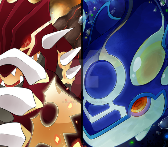 me encanta como usaste los colores para lograr que todo se viera más dramatico, en especial ese tono rojizo sobre Kyogre.