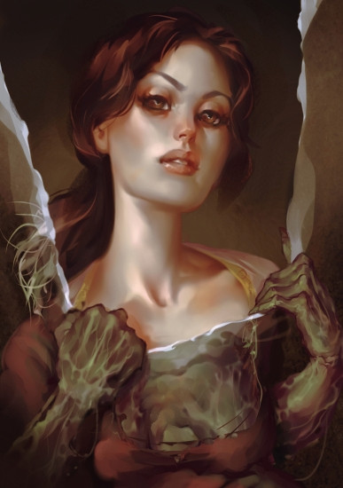 For a second I thought she had dark, deep eyes with reddish eyeballs... and it was scary!!! Great work!!