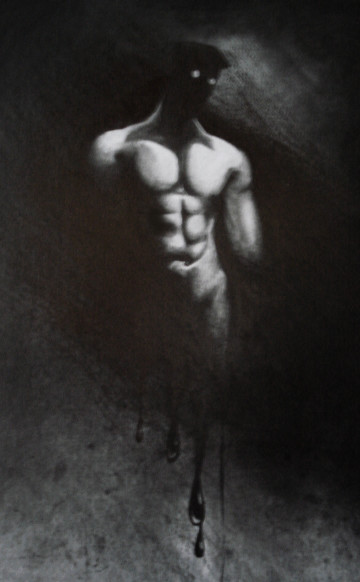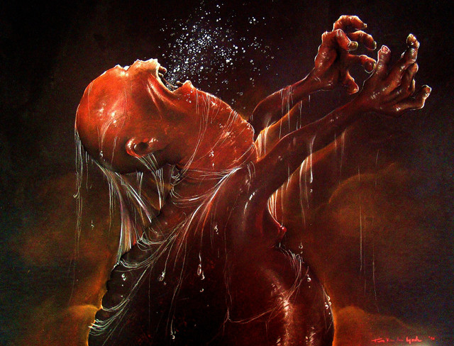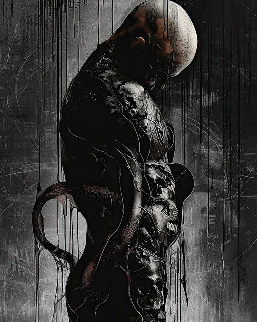 This might be one of my favorites! I really love how this looks, the veiny and and organical feel, the ripped paper/wall, the dark black behind, the use of white, the lighting on the surfaces gives them such a 3D effect, as well on the fractured wall as the veins and the devilish character, love the glowing eyes too, this is simply amazing! <3