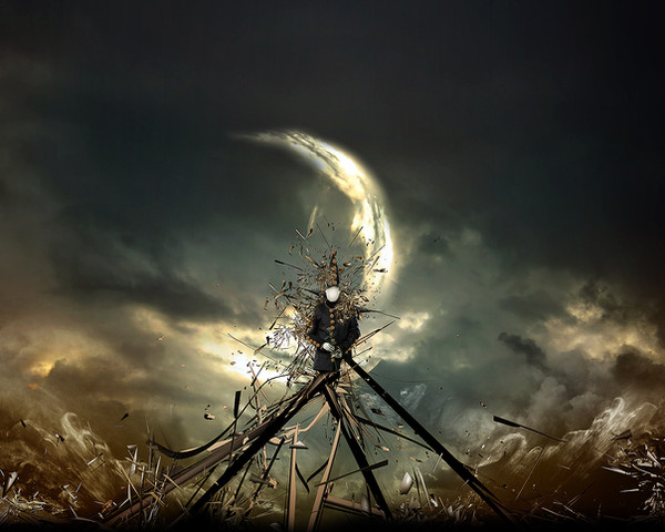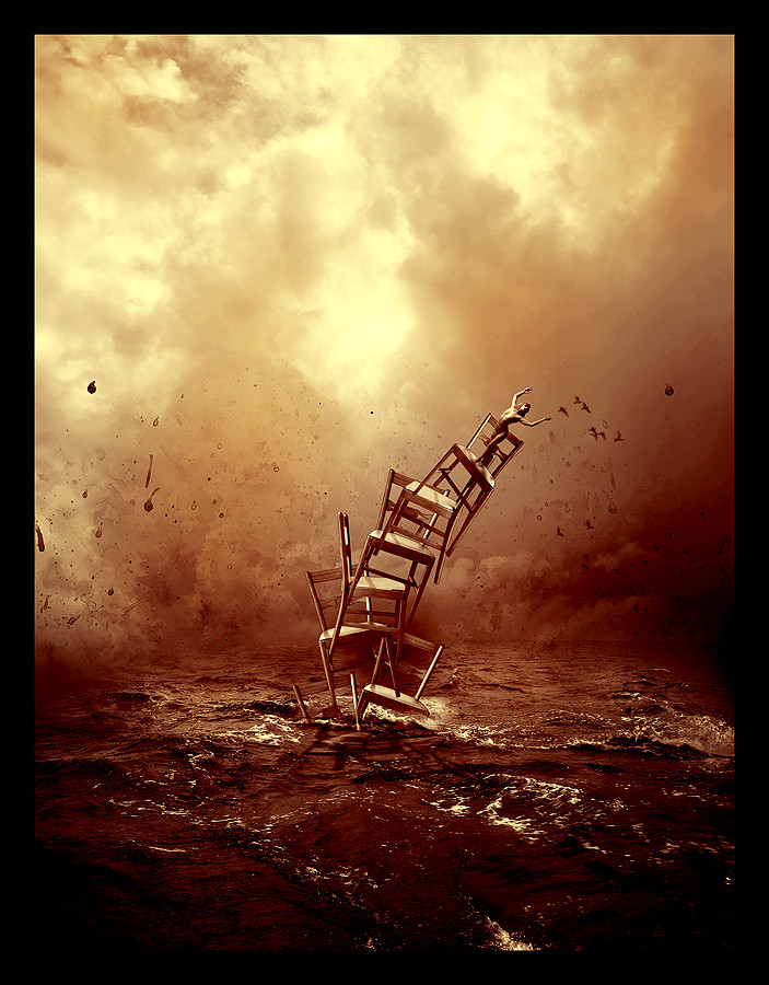 Amazing! The idea of a man standing on a stack of chairs in the sea to catch birds is a creepy, clever idea that only a surrealist would come up with. This is very well executed, especially the coloring. Well done.