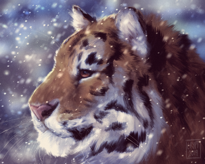 Sweet! This Tiger looks like he is in the falling snow, and looking for a nice warm cave.