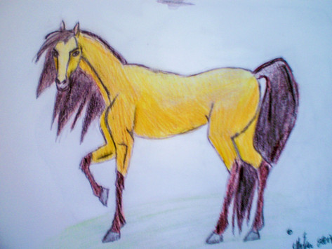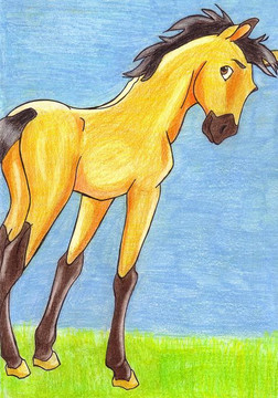 Well, i start with the shadows, like under his belly and all the other areas that might have a shadow on it and shade it with a dark brown lightly. Then i go back over with the yellow color and press hard to create a very solid color so none of the white paper shows through. Then i go over with white to add some highlights. Then after that just do the mane/tail and his legs with a dark brown and press hard like you did with the yellow. You can add some shadows and highlights by adding black and white to his legs and hair if you want. I hope this helps!