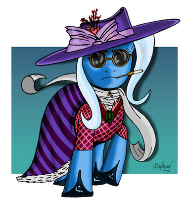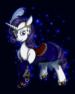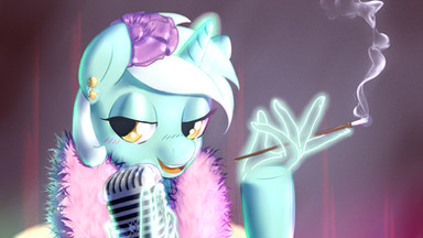My gosh, this looks so cool! I'm getting the biggest "Roaring Twenties" vibe by looking at it An age of manners, elegance and nostalgia: you are right, Coco embodies all of this perfectly. I love the golden details, above all the little crown with a plume she's wearing, but also the way gold and black blend on the lower part of her dress. That silver-plated cigarette holder also looks fantastic: makes me want to steal it for a character of mine XD I have a mare that was also kind of inspired by the Twenties, to the point where her very cutie mark is a cigarette holder. Though not as pretty as this one X3