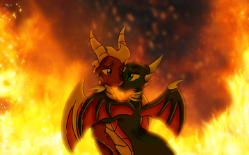 This is the scene where the world is ending I guess and Spyro and Cynder hold together as the world around them explodes. I put the fire as a symbol of guiding light, most importantly, in the song one of the main lyrics is: