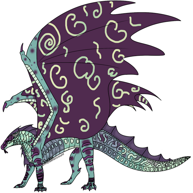 Tribe: SeawingxRainwing (80% SeaWing, 20% Rainwing) Lives in the Kingdom of the Sea. Cannot spit venom and can only change the colour of the scales that glow. Can see in the dark and breathe underwater. Usually changes her glowing scales to hot pink to flirt with and attract foreign males. The webs between her spines are clear coloured and transparent.