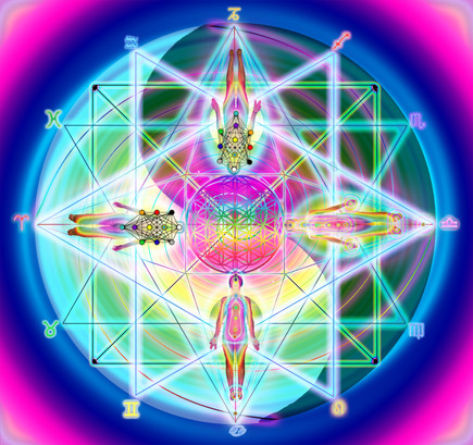 Around all of this are the 12 astrological symbols and the planets with the Sun and the Moon. These forces affect our personalities as well as everything around us all the time. The 5 platonic solids (5 geometric figures) and the sphere are formed out of Metatron’s Cube and are also fundamental building blocks for everything in existence. Around most of this is the 2d representation of the star Tetrahedron (6 pointed star). The star tetrahedron is the energy field that surrounds each living organism, each planet, each solar system, and the universe. During Merkaba meditation you awaked this field around you and use it to connect to the divine.