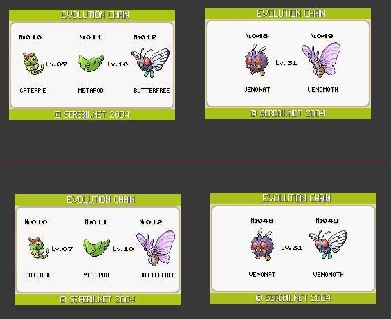 I'm in the same boat as you --for years it was totally normal for Metapod and Venonat to evolve into Butterfree and Venomoth. Then I saw a similar thing and just...it blew my mind! I gotta say though, Butterfree DOES look like a butterfly and Venomoth a moth, so they didn't get the names mixed up. They totally should have switched the colors and the basic looks though (eyes, antennae/horns). They totally screwed up there! XD Maybe they were high? Ya never know, then again some of those Pokemon...