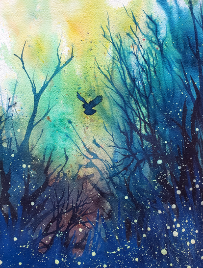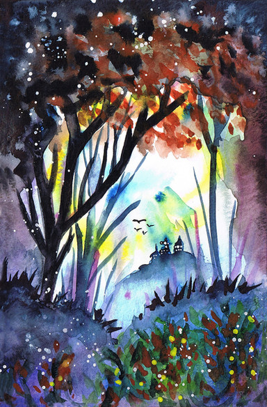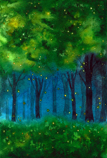I've been fiddling around with this one for a while now. It started out as a much bigger painting. Then I put it away, thinking it was a lost cause. Later I decided to give it another chance and sized it down. Adding the little fireflies really added another layer and now I'm quite happy with it.