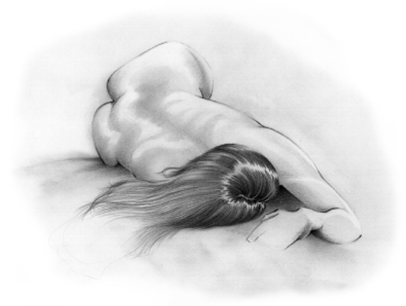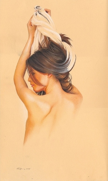 really amazing realism, but its been stylistically merged into the back ground. well done. i really like teh highlights. the shoulder seems a bit pointy to me... a mere amature haha, just a thought. nice use of gradients