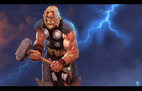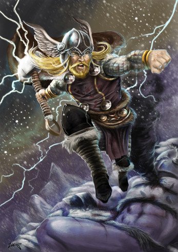 MjΓΆlnir sure is big! Very good use of shadow and highlighting. The lightening is nice compositional element.