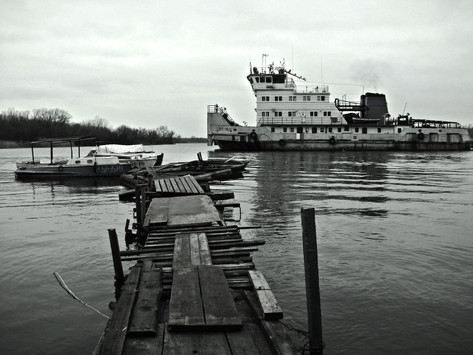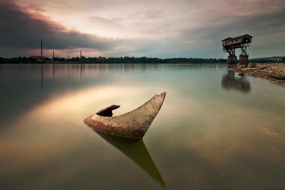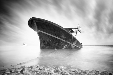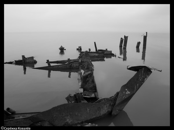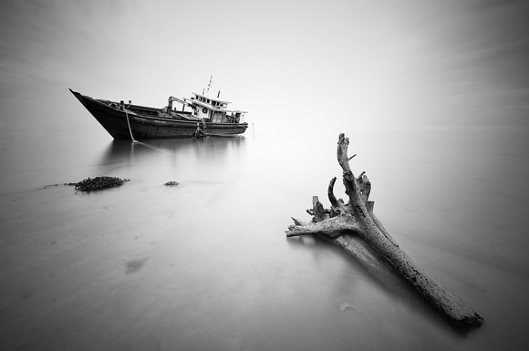 "I love scenery like this. Dead trees near a shore with water that seemed to have receded a long time ago. Bonus love for the fog, gives it a 'Silent Hill' feel, mystery of where you are going and what's ahead. Kind of makes the boat seem endless since you cannot quite see the end of it. Speaking about the boat, it just makes me want to find a way in and explore."