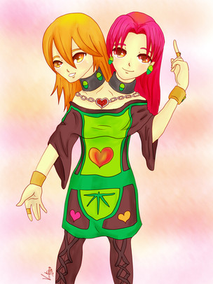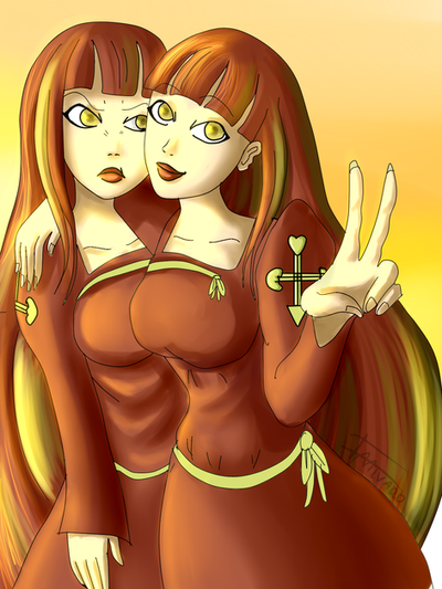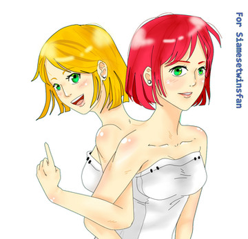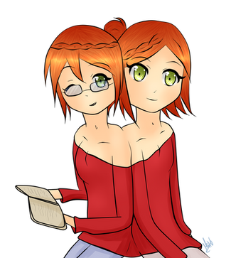They were born joined back to back, their names are Morgan and Amy St. Claire, Morgan's the blonde, Amy's the redhead. Those are their natural hair colors, they were born with a condition called Leidner-Bullard Syndrome, which causes identical twins(Siamese twins are always identical twins) to be born with different colored hair(don't bother looking it up, I made the condition up). They released their first album in the fall of 1987, and the lead single, "2 Heads (R Better Than 1)", went to the top of the charts.