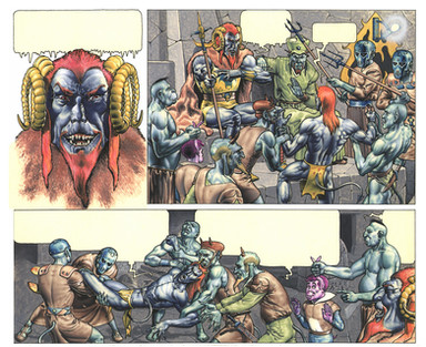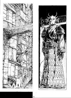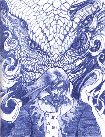 A depiction of a scene from a book called 'Gardens of the Moon' by Steven Erikson. The blue man on the right is a mage called Anomander Rake, and is looking down on the city of Pale (read the book) and the macician Tayschrenn, who is throwing waves of power up at him. Pen and ink background, felt-pen renderings.Related content