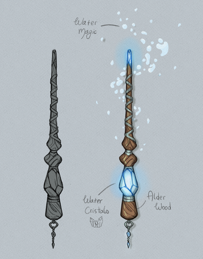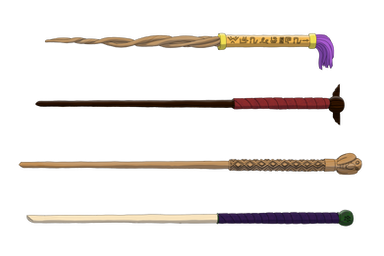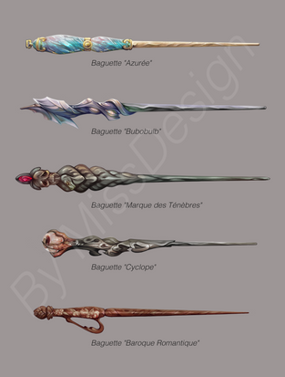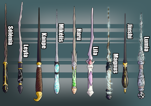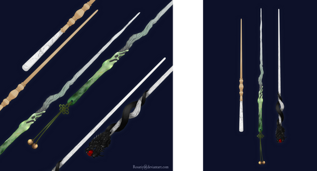 Wand Designs for the main cast of my wizard story. I might go back and revise some of them later. In this verse, wands are often created by -- and grow with -- the wizard or witch they are used by. The materials of the wands have to 'resonate' properly with the energies of the user, and certain wands are better at certain kinds of magic than others. They have personalities -- some are more stubborn and hard to work with than others -- and are very unique to the user, changing over time as their magic develops.From top to bottom: