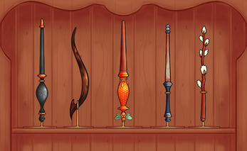 * Ms. Hazel -- Holly wood, with gold and an amber stone. Attunes her to the natural world (amber being fossilized tree sap), but also to fire (holly color and association with fire).