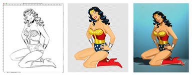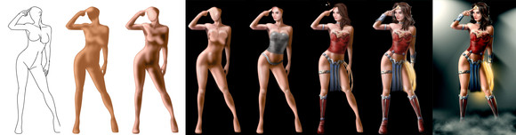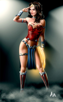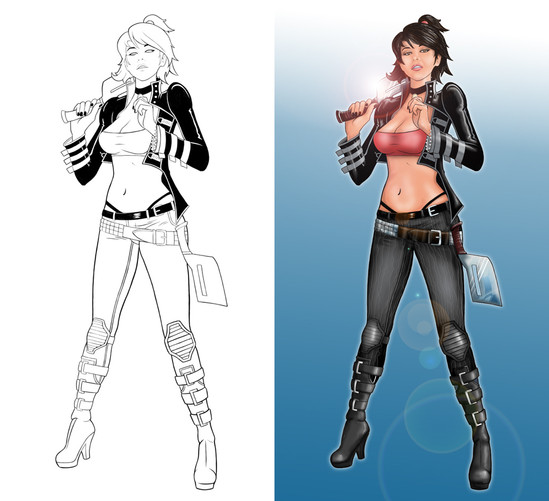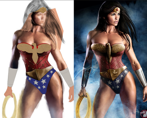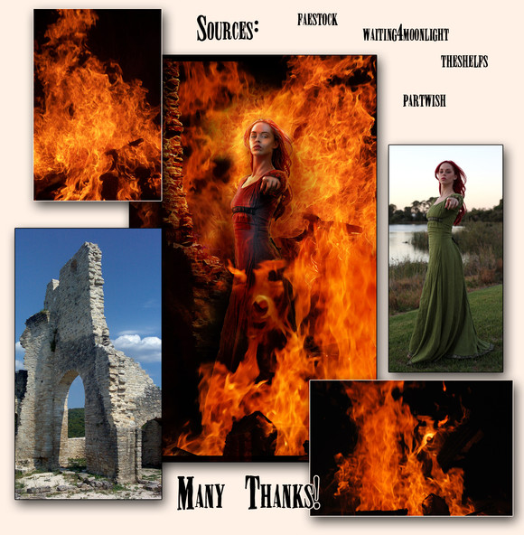 You did a great job on editing the girl's photo, on the "drawn-like" look. Though I wanted to point on some weird things. For example now she has very sharp contours, especially on the dress, on the left side of it these ones are highlited, but n a very thin line. Wall behind her could be in defocus, what explains blurry look, but there are black things on the bottom of the screen which then should be not in focus too (but thats just me goind nerdy cos pic probably had to look like painted). As for other things - there is an area with green color to the left of her face. That could be because of smoke, but its only on that small area, maybe it would be better to make the smoke more obvious or just reduce the amount of green. Probably lights on the girl need to be closer to orange.