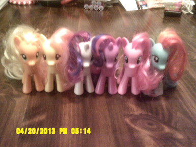 FINALLY I got an applejack (5 in )for the love of luna she's been the hardest to get I swear to celestia those that make the joke she is best background pony have no idea how damn hard she is to find. DERPY is easier to find in the show then AJ on the shelf. also scored a cheerilee (10 in. with meh cutie mark) and I even got the twins an adorable 10 inch Vinyl Scratch and her sis an adorable 5 in. DJ Pon-3. and yeah i know what your thinking "hey dumb ass DJ pon-3 and vinyl are the same" well nope sorry but your wrong. ones the mistress of wubs and her sisters the heavy hitter with the bass. ^^
