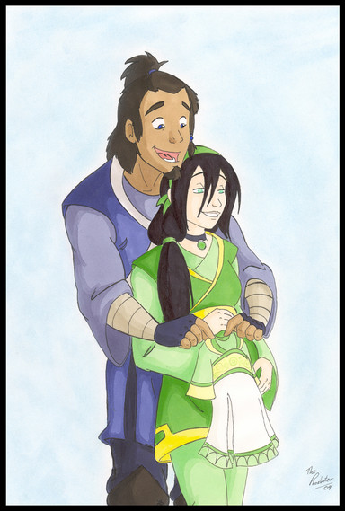 Anyways, the drawing was supposed to have a comic like look, and I'm fairly satisfied with the end results. I took the liberty of adding a piece of "Stormbenders" canon to my drawing. And before anyone can yell "teen pregnancy!" this is an AU where Katara & Zuko are old and married and living as vigilantes!!