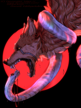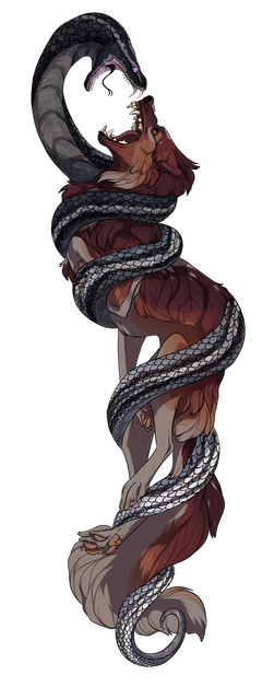 just don't have the energy to do anymore to this this shit has been sitting in my folders forever asjkldfjdsa i might as well post it. its nova and her snake sebastian. they're friends i just wanted to draw a mean noodle. he wouldn't actually bite her. i gave nova's design a slight touch up bc she's been lacking some things. she looks more like a wolf now finally.(also removed the blood bc i didn't like it)