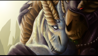 . Темнота и отдельные источники света по особому раскрывают идею и образы. Рут впечатляет энергетическим гребнем и наличием двух пар крыльев. У тебя это выглядит настолько непривычно, неожиданно. Ива имеет тоже светлый гребень, но её гребень выглядит более приземлено. Она мощная, да, она пугает мощью и короной шикарных рогов, как таран. Мощные, тяжёлые рога, острые, размашистые, широкие. Правда с этого экрана я не сразу разглядела, где второй рог, а он, оказывается, развёрнут на зрителя. И я вижу у Ивы помимо отсуствующих крыльев ещё одну пару конечностей, они кажутся больше лапами, чем крыльями. А какие у них обоих морды! И я только сейчас поняла, что у них нет глаз, а это создаёт такой эффект, что просто выносит
