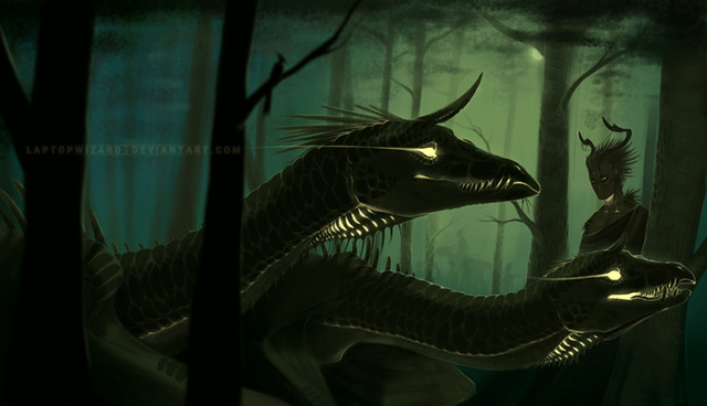Картина немного не правдива. На тот момент, когда Снайп и Ферокс появились на свет, Ива (массивный монстр без крыльев) и Торут (худой и крылатый монстр) стали врагами, жаждущими друг друга уничтожить, но действия их осторожны и просчитаны как в шахматах. Почему рабочее название матери и их дочери? Всё просто. Ива создала Снайп, а Торут перекроила Ферокс из души Синильги (немного позже будет раскрыт небольшой архив о ней и Кындыа). Своего рода, монстры творцы, а эта парочка их творения... Данный рисунок просто показывает насколько огромны эти существа, но при этом они довольно аккуратны, чтобы не уничтожить свой главный приз на случай победы - Мир Пяти Параллелей...