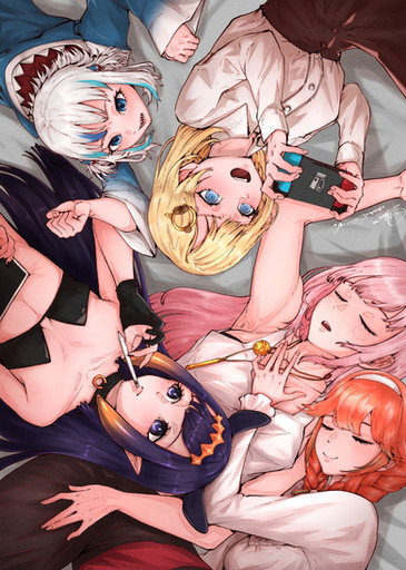 Image I did for the drawthreads. The request was for Seraph of the End characters: Shinoa, Krul, Horn Skuld, and Chess Belle playing a game and relaxing. The choice of game was up to me.