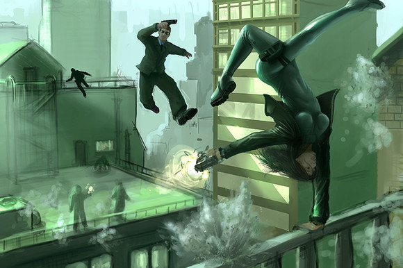 i suppose this scene was inspired by episode 4 in 2nd GIG (GITS fans know the one i mean) theres an amazing scene at the end where kusanagi and her tachikoma are chased under a hail of bullets from one of the Hornet attack copters...so i painted my version of that