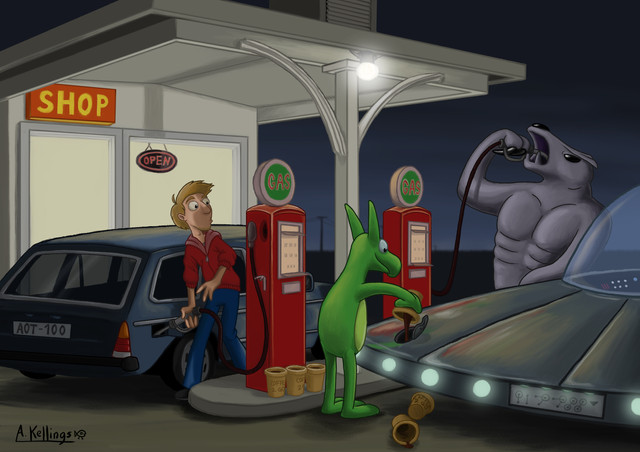 A green alien critter opts to refuel his ride on his way to the city. I'm thinking of doing more with this character.Also meant to be something of a reference to Pluto and Charon, in honor of their imminent exploration in just three months from this posting date.