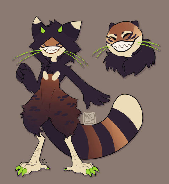Design notes: She has a kind of unsettling smile. She shows her teeth a lot; she has two upper canines on both sides of her mouth but only one set of lower ones. She is missing her left ear; there is a scar that arches over her ear hole. There are three brown spots on the right side of her stomach, two on her left knee, one on the back of her neck, and two on the side of her left foot. There are two black spots on the left side of her chest and 3 more clustered on her left side. Her tabby markings aren't random but if you draw her, feel free to take as much liberty with them as you want. She stands a little over 3 ft tall.